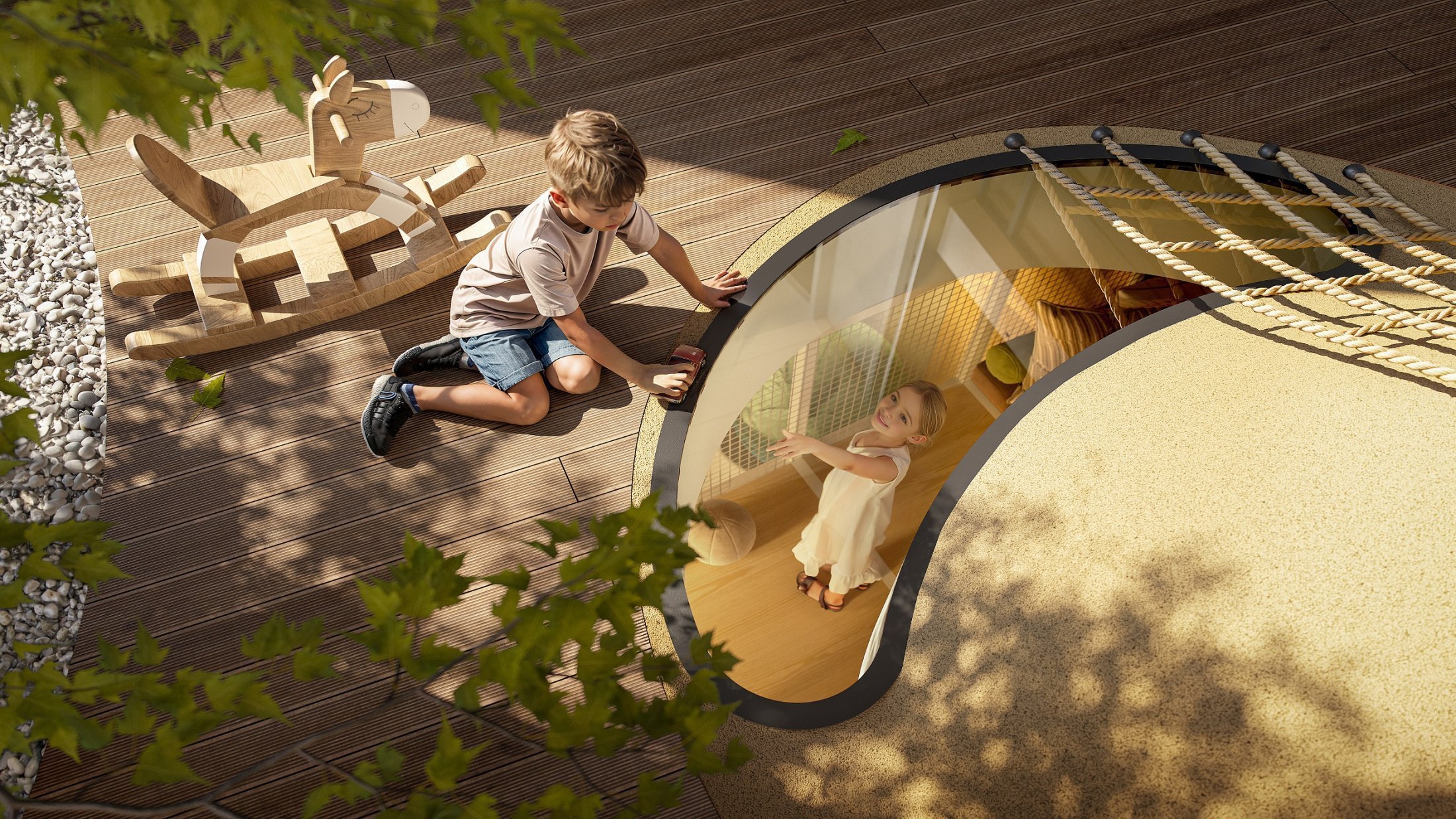 - Приглашение к общению: мы используем звуковые трубы, перископы, иллюминаторы, системы для игр с песком и прочие элементы, побуждая детей сотрудничать и дружить.